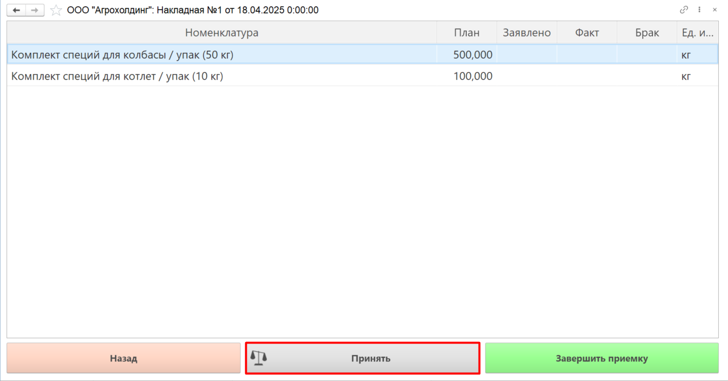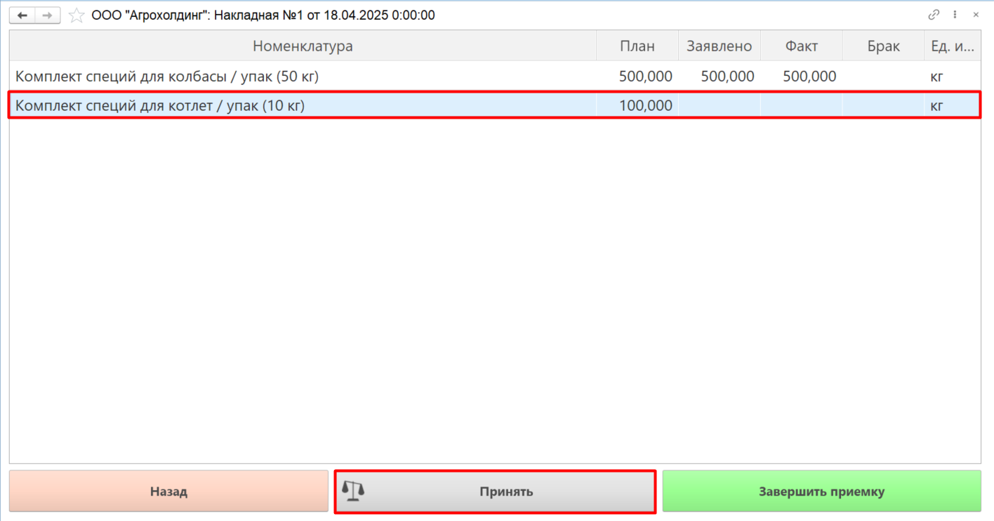 - Если необходимо добавить партию или отвес какой-либо номенклатуры, нажимаем кнопку "Принять". Далее повторяем все действия аналогично первой номенклатуре: