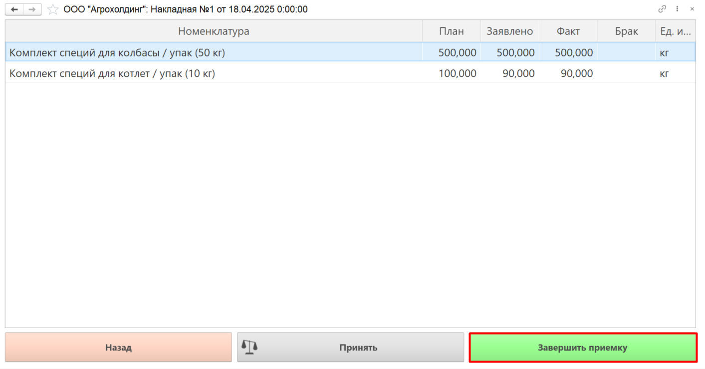 - Если приемка номенклатуры по данному документу завершена, нажимаем кнопку "Завершить приемку":