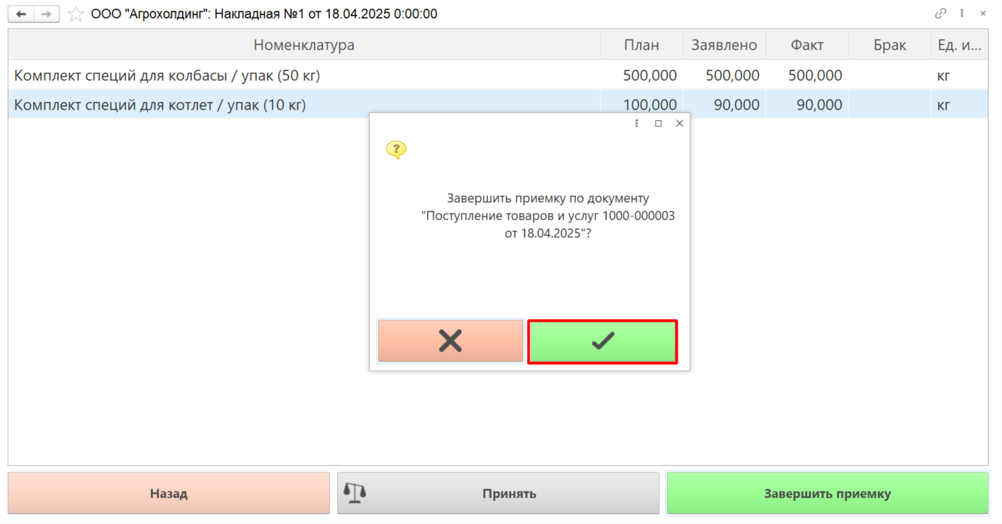 Откроется окно подтверждения приемки: