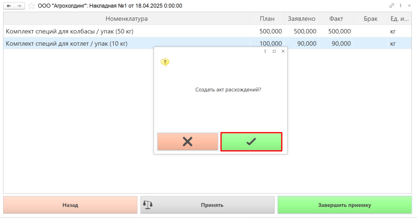 Если по документу выявлены расхождения фактического количества сырья с запланированным, система предложит создать акт расхождений. Если по мнению пользователя, отклонение от нормы в пределах допустимого, он может отказаться от создания акта.