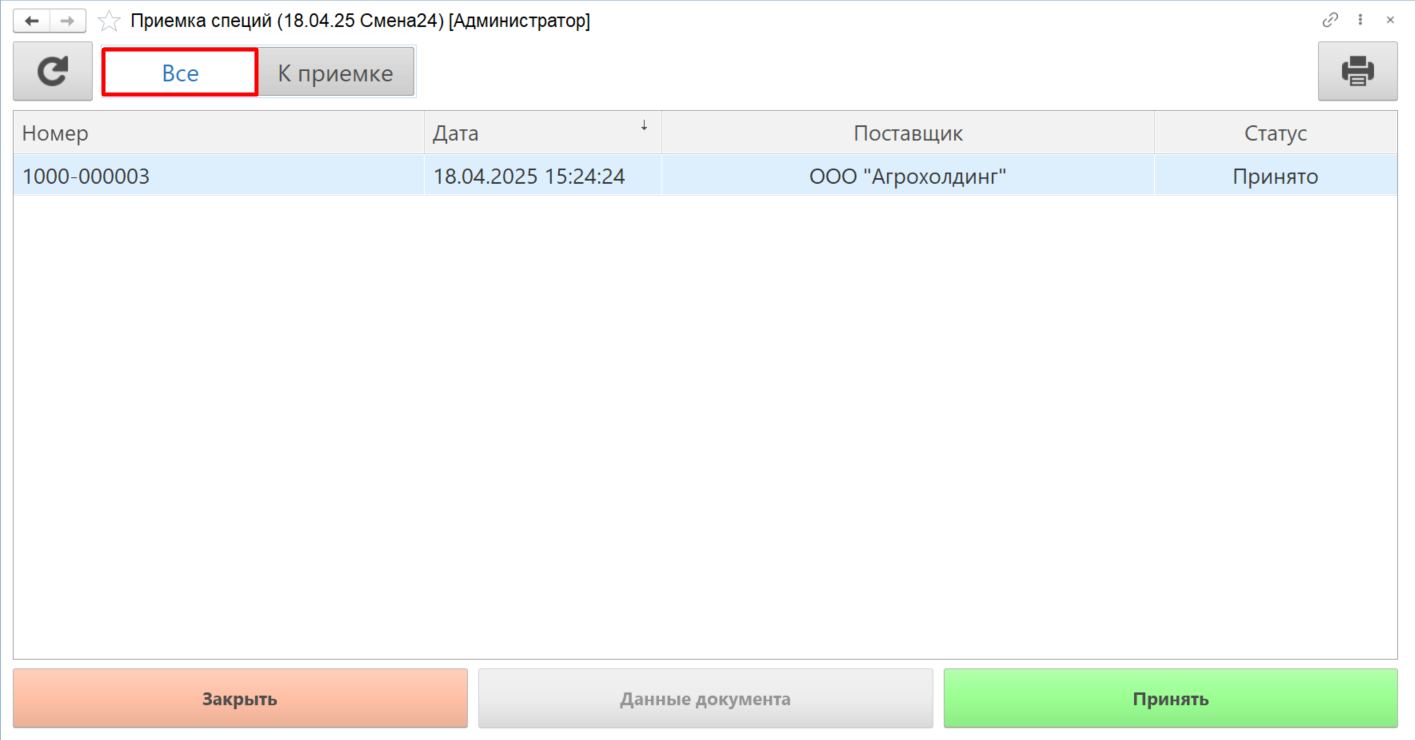 Чтобы увидеть список документов "Поступление товаров", которые были обработаны за текущую смену, в основном окне АРМ переключаем отображение документов в значение "Все". Обработанные документы отобразятся в списке со статусом "Принято":