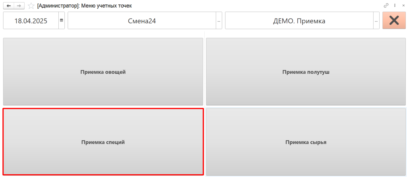 - Указываем дату планового поступления, смену и рабочий участок, на котором проводится приемка. Нажимаем кнопки: "Приемка специй" или "Приемка овощей"