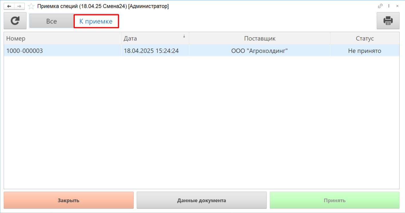Нажимаем кнопку "Приемка" для приемки сырья:
