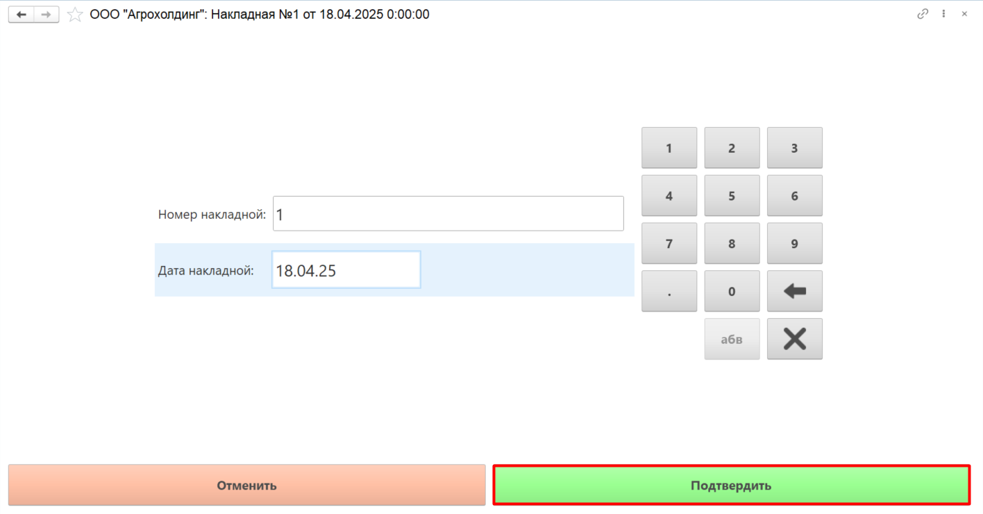 Поля "Номер накладной" и "Дата накладной" заполнятся автоматически по данным документа поступления, при желании можно изменить вручную.