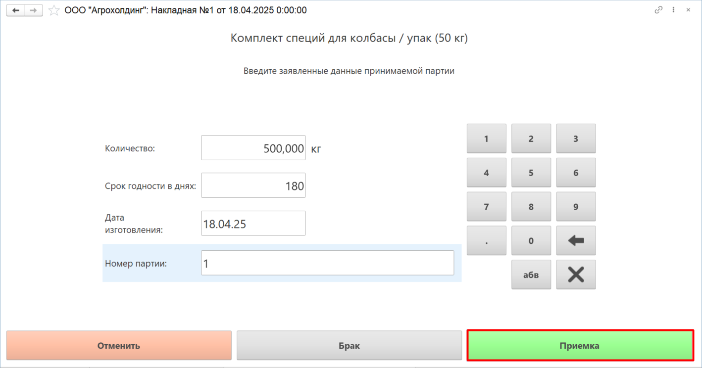 Вводим количество номенклатуры в килограммах, срок годности в днях, дату изготовления и номер партии.