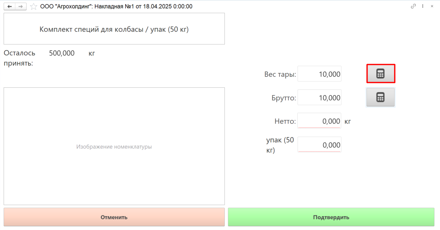 Открывается окно для учета данных взвешивания сырья. В левом верхнем углу отображается информация о номенклатуре и количестве, которое осталось принять.