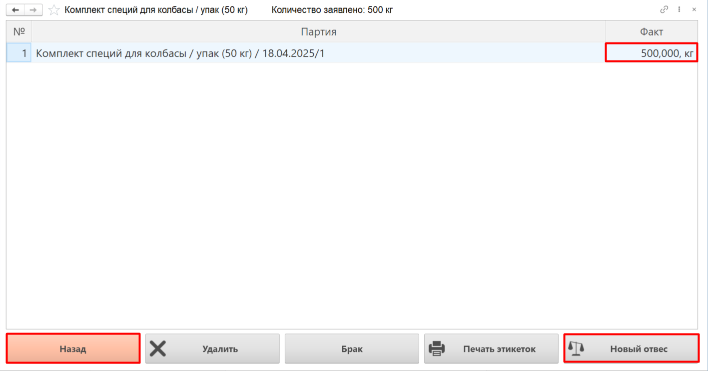 Если в партии обнаружен брак, необходимо взвесить его, нажав соответствующую кнопку. Подробнее о приемке брака читайте в разделе "Отбраковка"