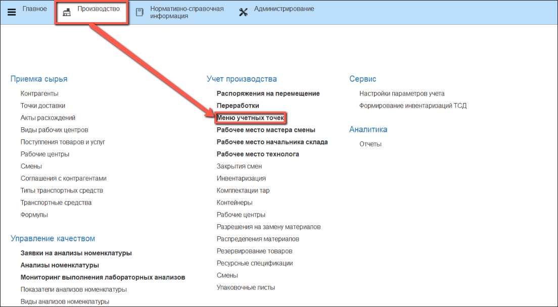 - В подсистеме "Производство" открываем "Меню учетных точек":