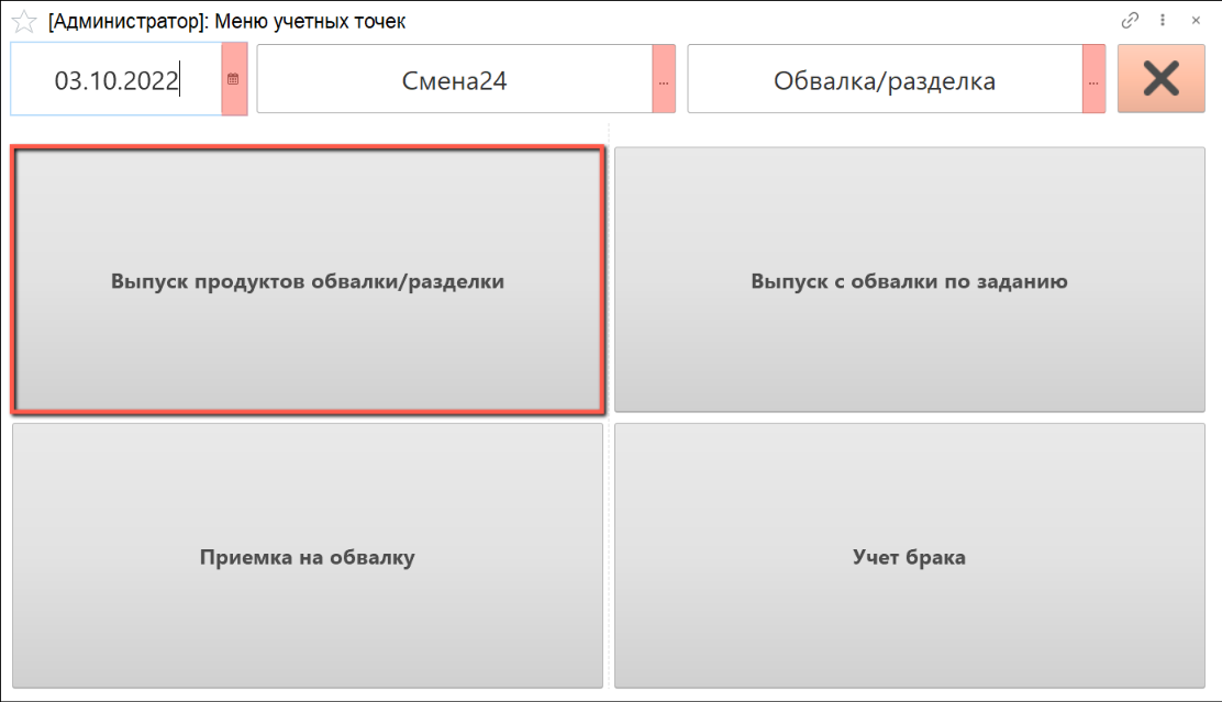 - Указываем дату смены, смену и учетную точку, на которой производится учет взвешивания продуктов обвалки. Нажимаем кнопку "Взвешивание продуктов обвалки/разделки":