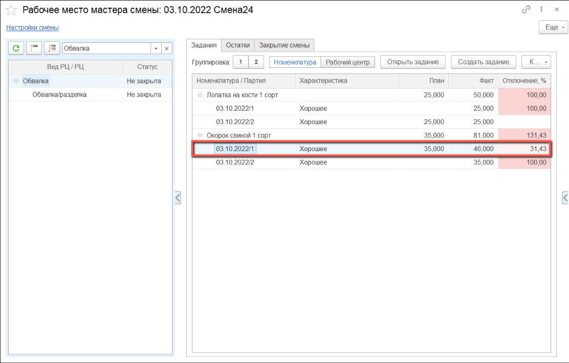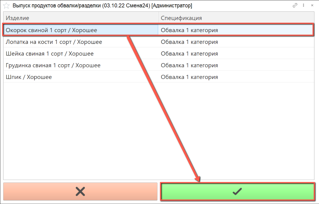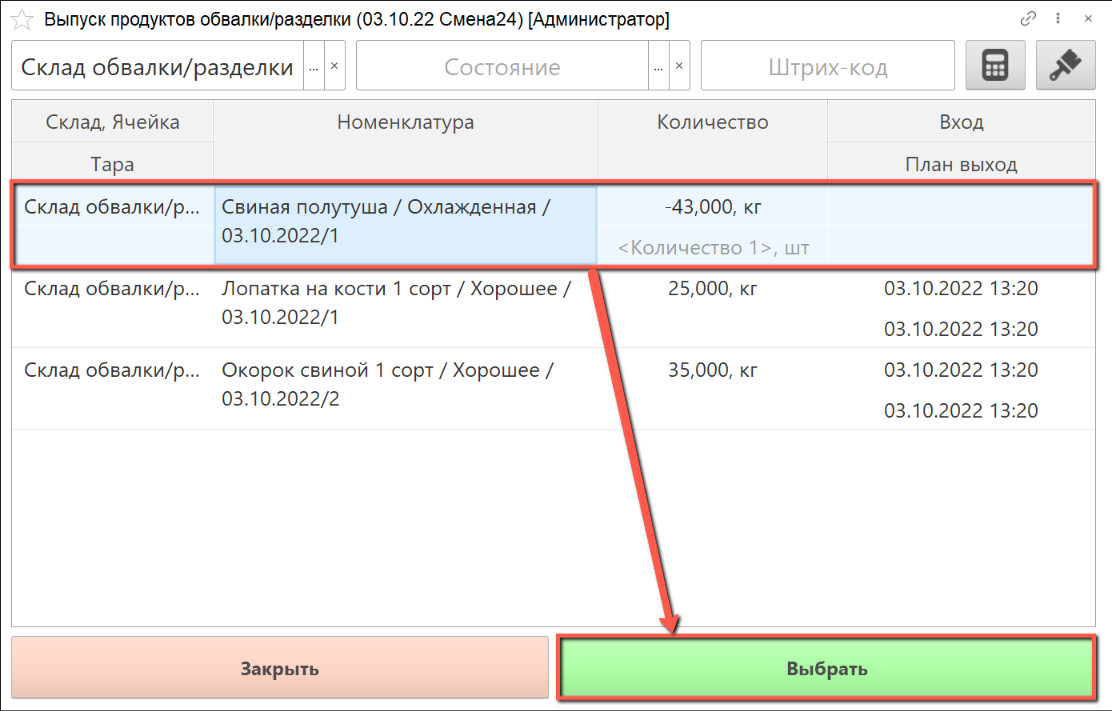 - Выбираем в списке партию сырья, по которой планируется выпуск продуктов обвалки/разделки: