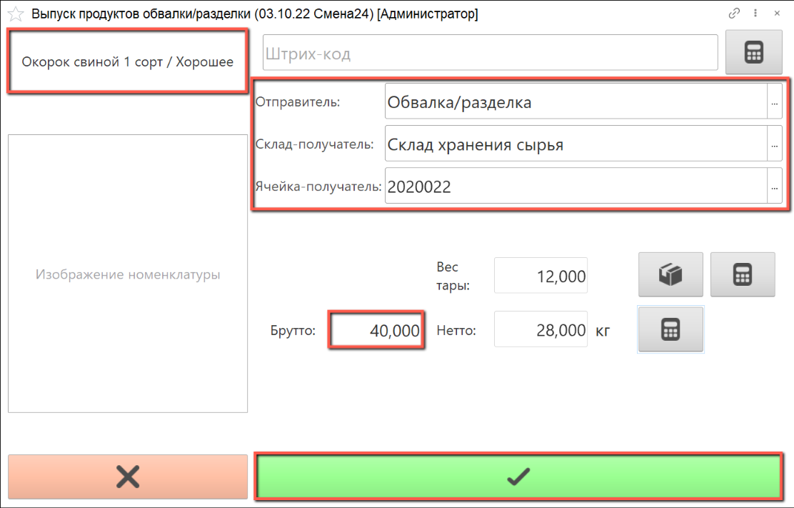 Получаем с весов вес брутто, вес нетто рассчитается автоматически, нажимаем на кнопку "Подтвердить":