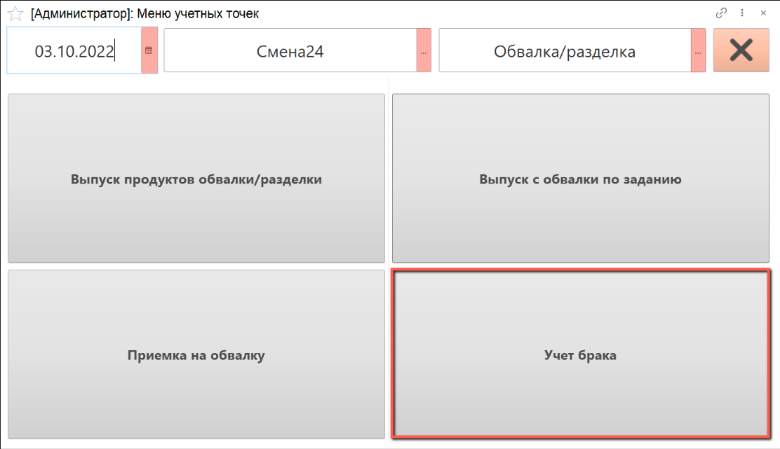 - Указываем дату смены, смену и учетную точку, на которой производится отбраковка продуктов обвалки. Нажимаем на кнопку "Учет брака":