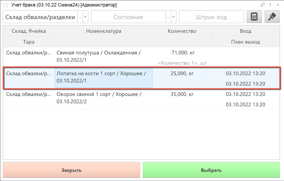- Выбираем из списка партию сырья, в которой обнаружен брак, либо сканируем штрихкод этой партии: