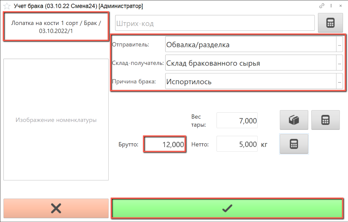 Получаем с весов вес брутто, вес нетто рассчитается автоматически, нажимаем на кнопку "Подтвердить":