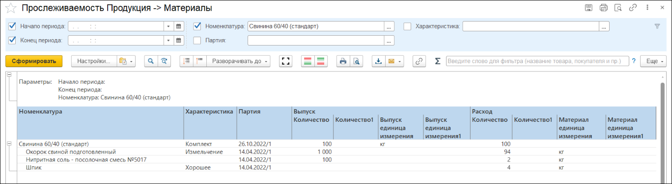 Таким образом, если в партии готовой продукции выявлены качественные или количественные отклонения, отчет позволяет определить, корректно ли был соблюден процесс производства и какое сырье было использовано в процессе.