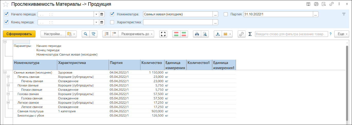 Данный отчет позволяет определить, какие полуфабрикаты и готовые продукты и в каком количестве были произведены из одной конкретной партии сырья.