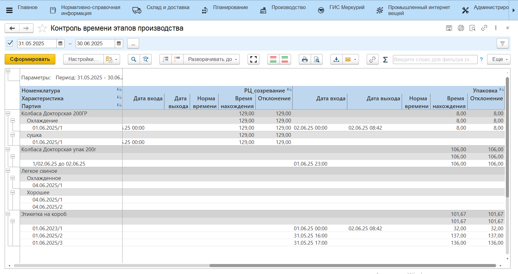 - Отклонение - отклонение фактического времени нахождения на рабочем центре от нормативного.