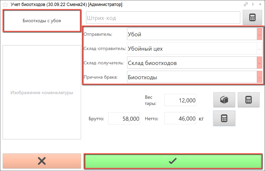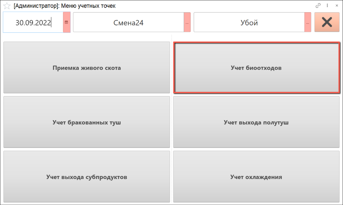 - Указываем дату смены, смену и учетную точку, на которой производится учет. Нажимаем на кнопку "Учет биоотходов":