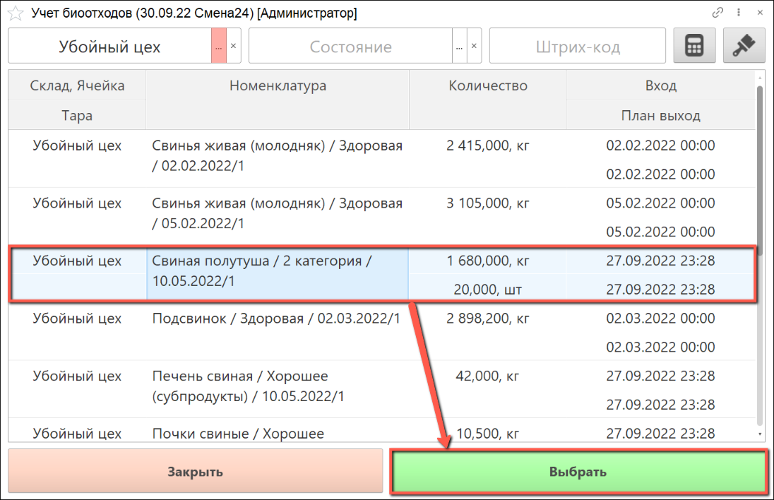 - Открывается список партий сырья, которые на данный момент находятся на участке убоя.