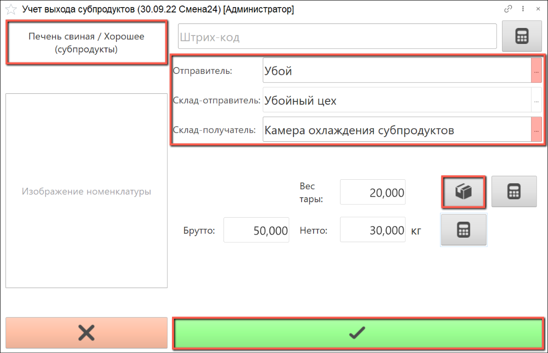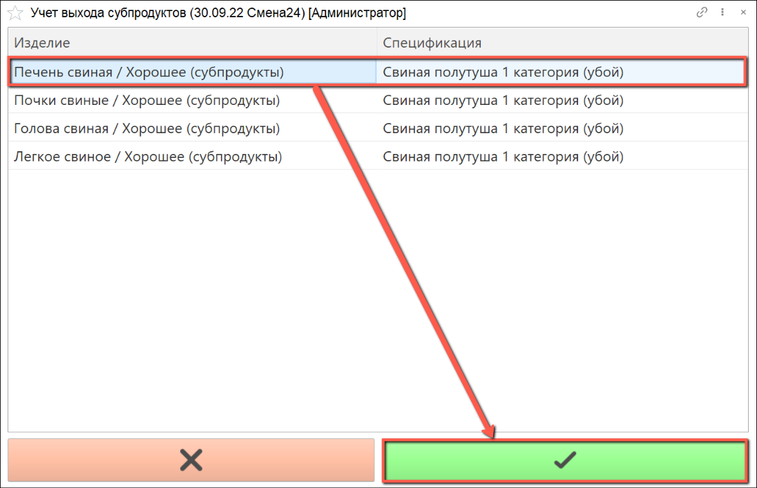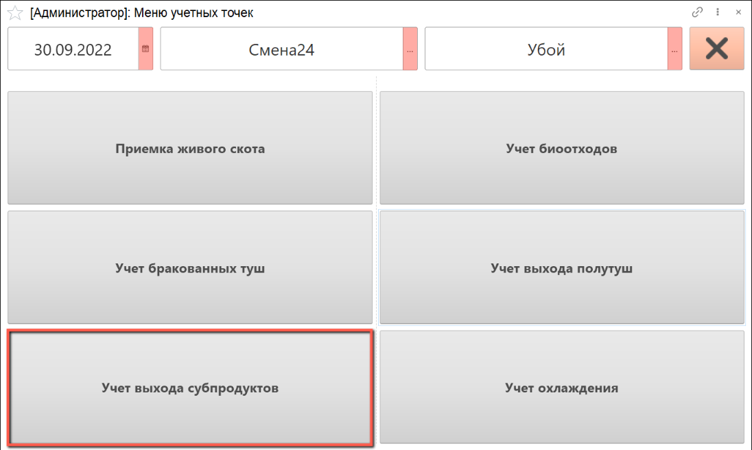 - Указываем дату смены, смену и учетную точку, на которой производится учет. Нажимаем на кнопку "Учет выхода субпродуктов":
