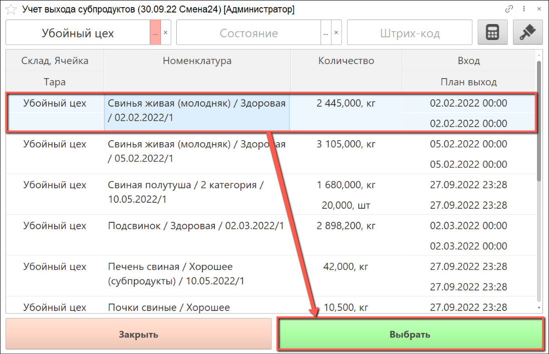 - Выбираем склад, на котором производится взвешивание полутуш. Находим партию сырья, по которой необходимо произвести учет выхода субпродуктов и нажимаем кнопку "Выбрать":