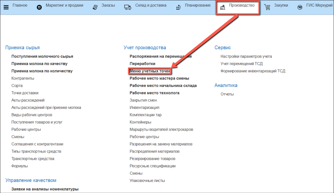 - В подсистеме "Производство" открываем "Меню учетных точек":