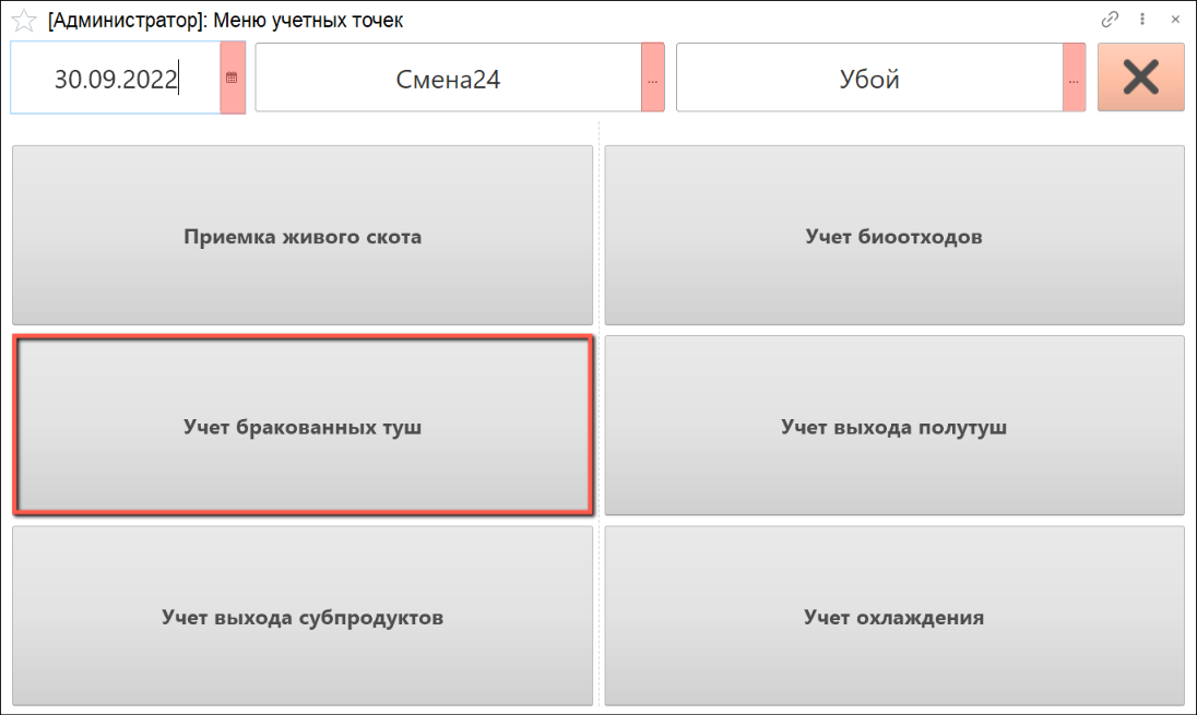 - Указываем дату смены, смену и учетную точку, на которой производится учет. Нажимаем на кнопку "Учет бракованных туш":