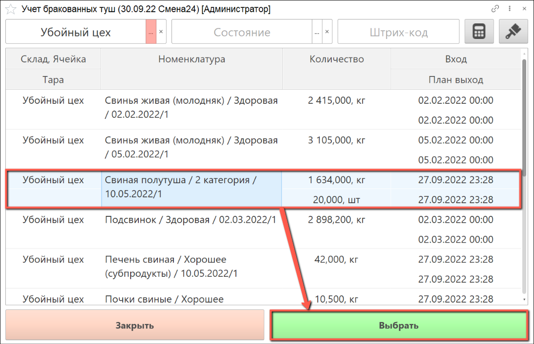 Открывается список партий сырья, которые на данный момент находятся на участке убоя.