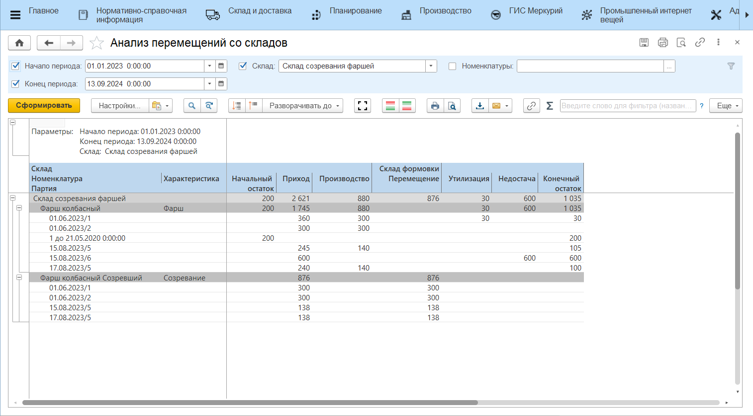В отчете отображается приход, расход (по разным типам), начальный и конечный остаток партий на выбранном складе в пределах указанного в параметрах периода.