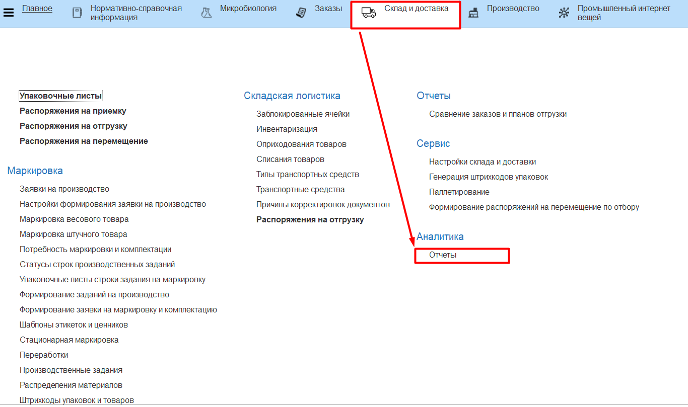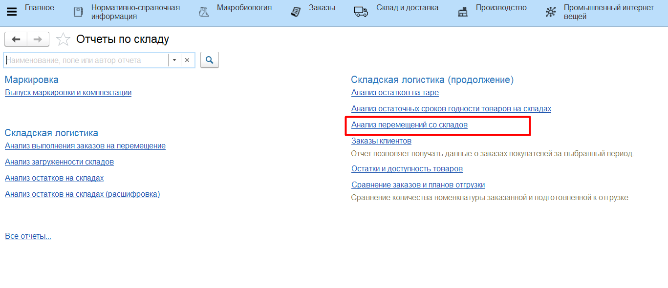 Для анализа перемещений со складов предусмотрен отчет "Анализ перемещений со складов". Отчет расположен в разделе "Склад и доставка" в подсистеме "Аналитика" - "Отчеты".