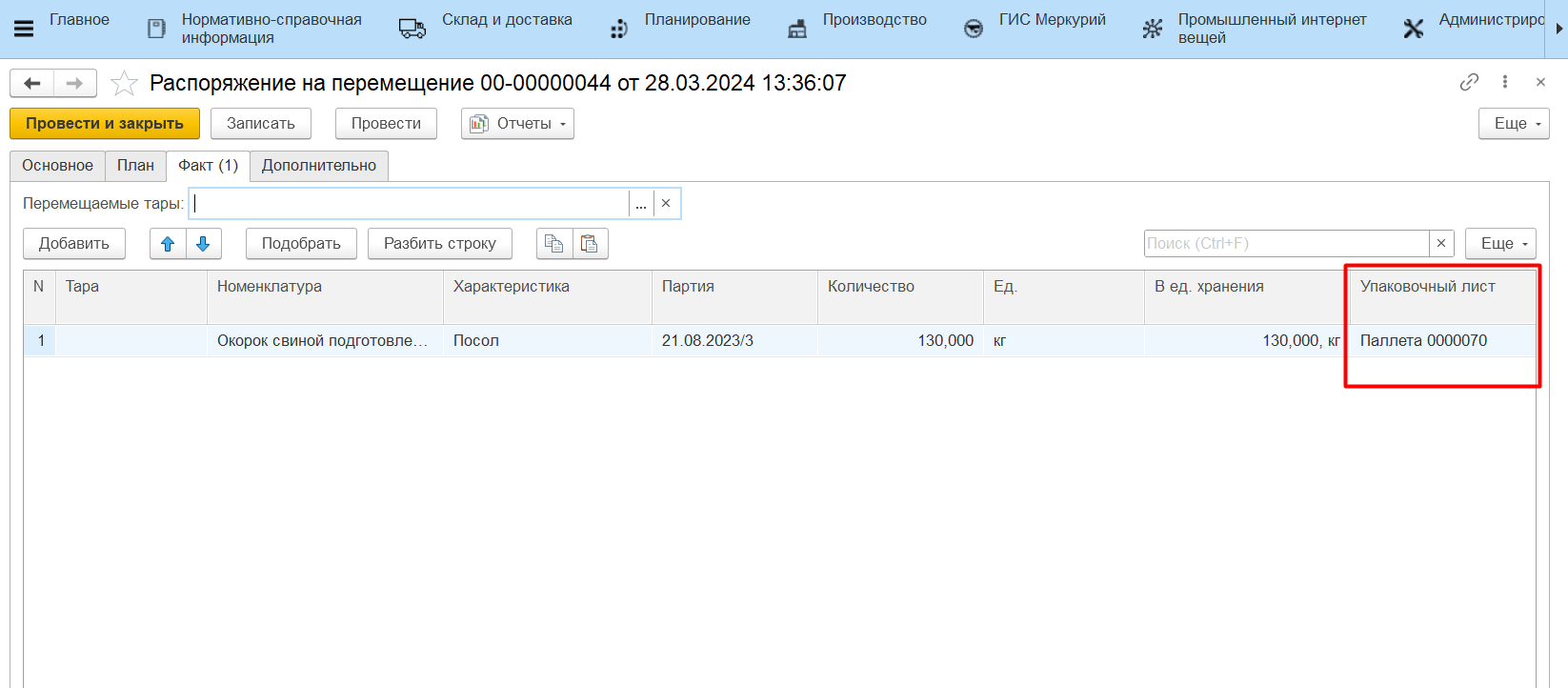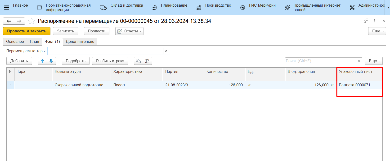 По итогу будет сформирован документ "Упаковочный лист", содержащий информацию о весе паллетированной продукции, а также документ "Распоряжение на перемещение" для перемещения тары (паллеты) на склад-получатель.