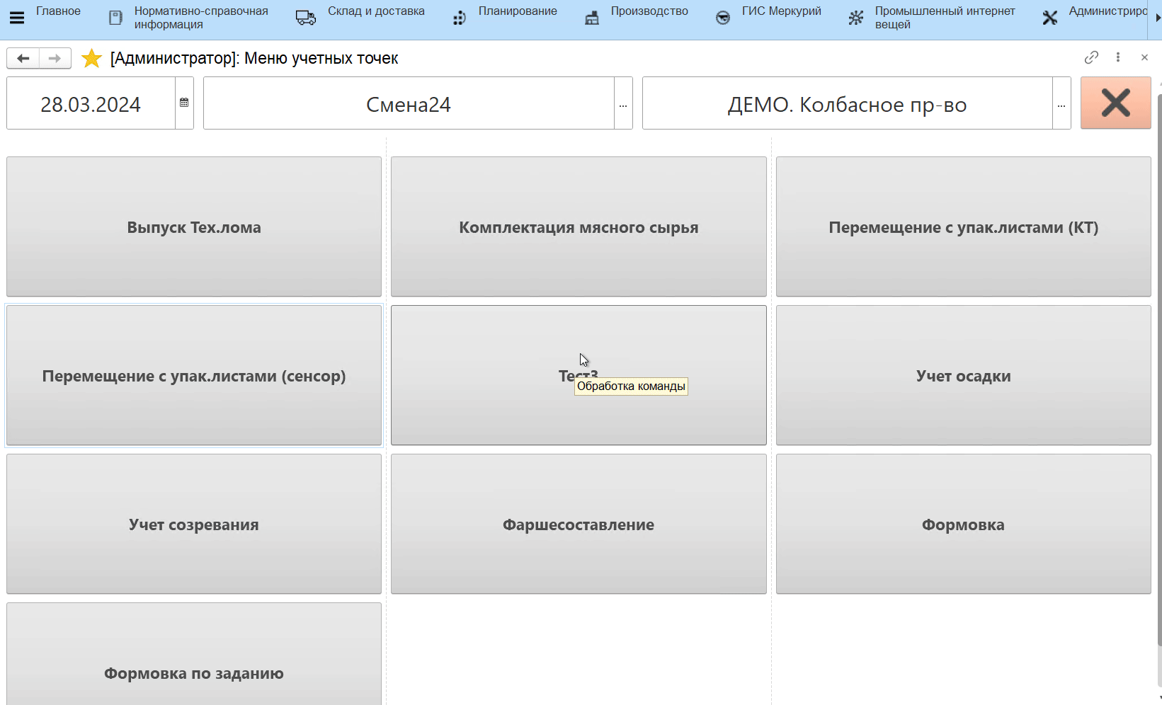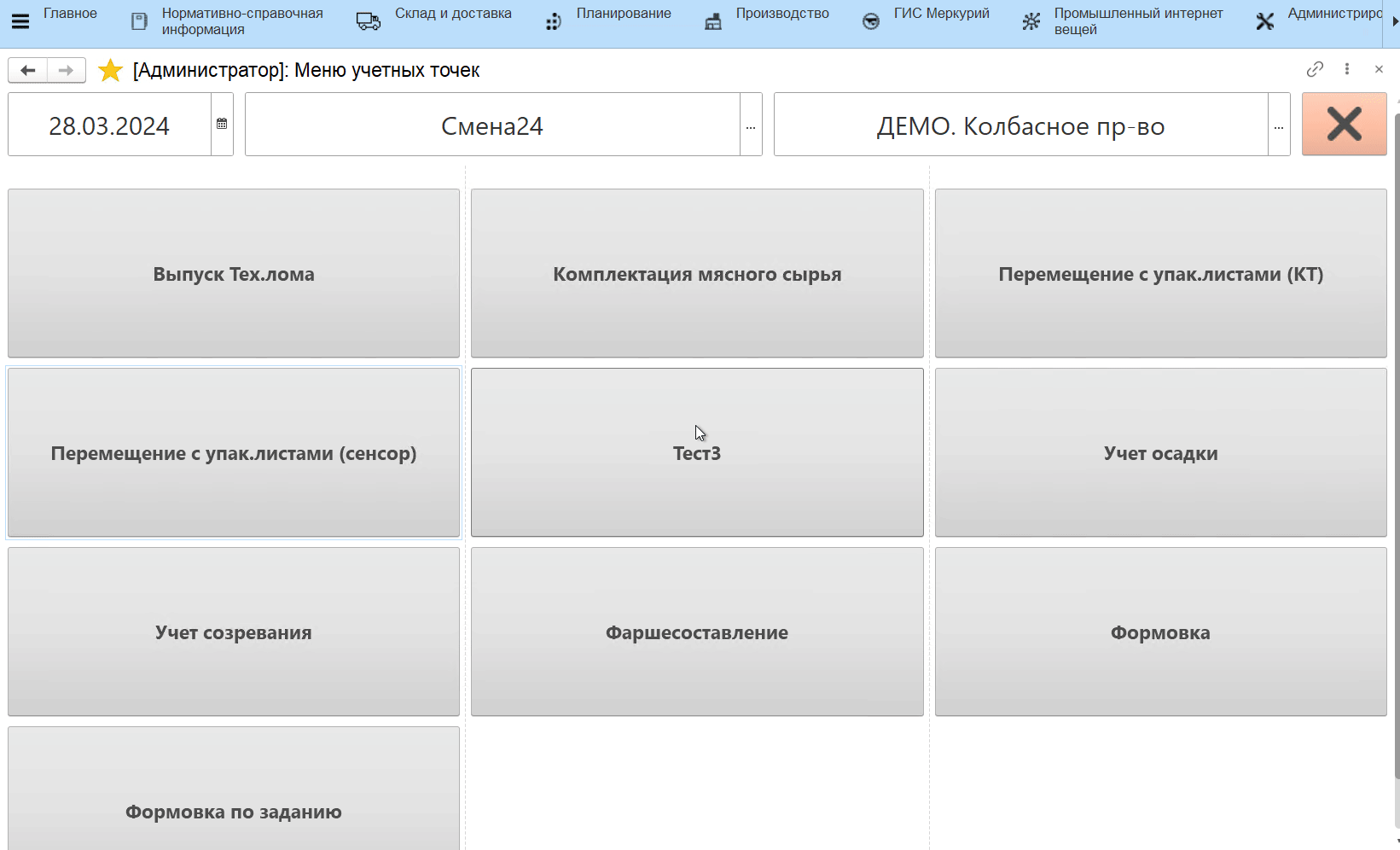 - Открыть "Меню учетных точек", выбрать дату смены, смену и рабочий центр;