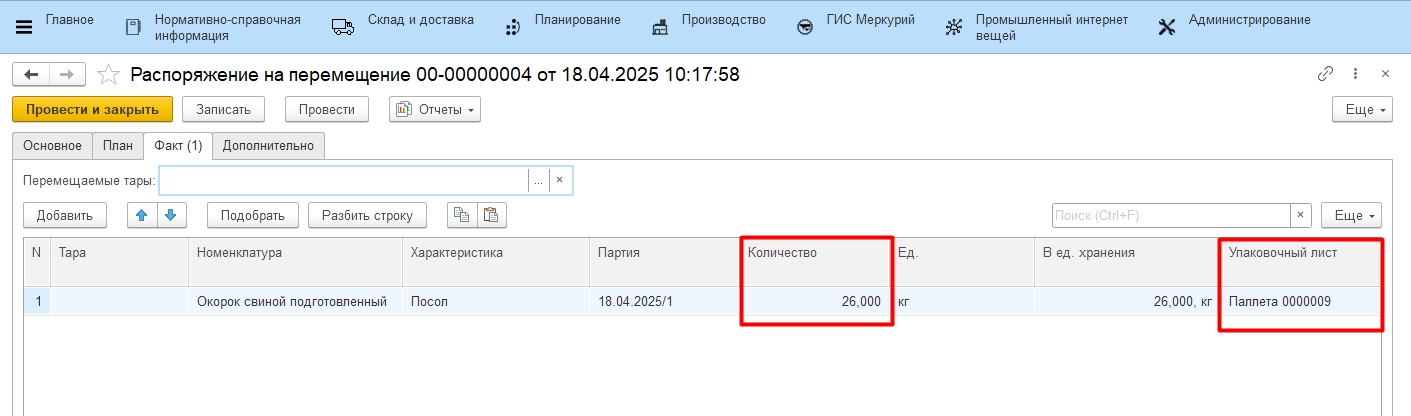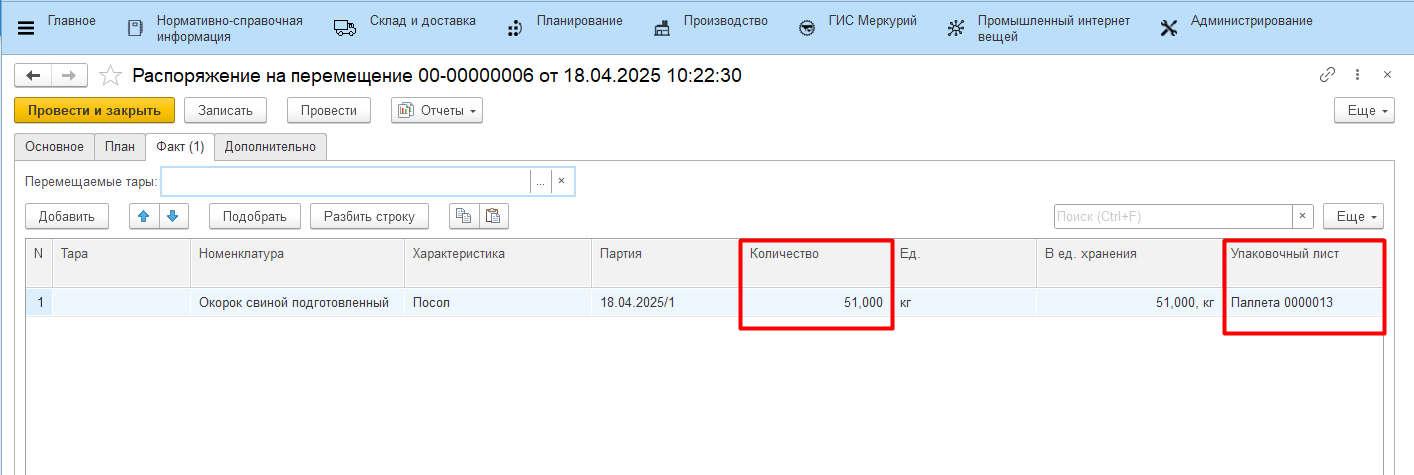 Если на какую-либо продукцию, находящуюся на таре (паллете), уже сформирован упаковочный лист, и теперь часть продукции с этой тары нужно переместить на другой склад производства, предлагается воспользоваться частичным перемещением.