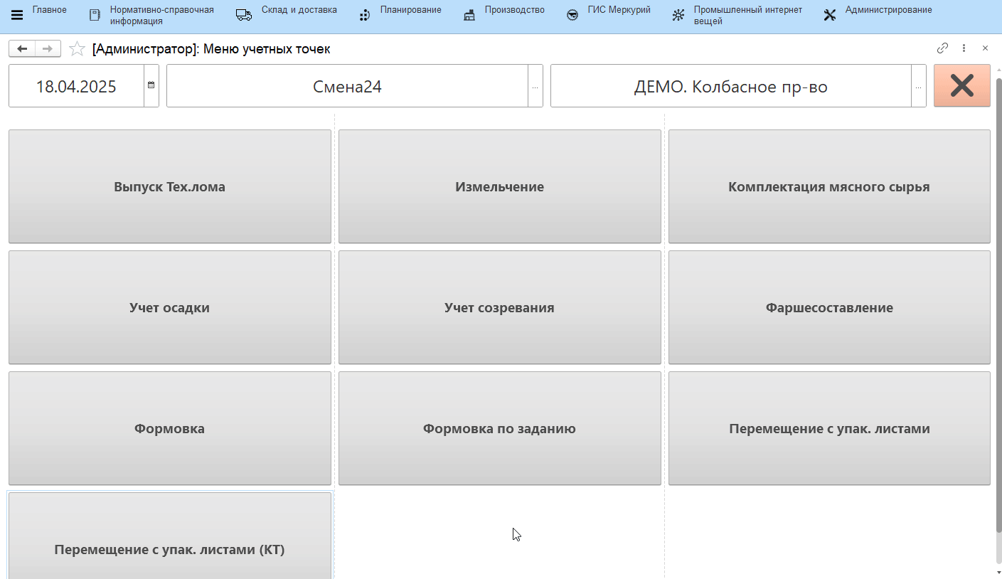 - Открыть "Меню учетных точек", выбрать дату смены, смену и рабочий центр;