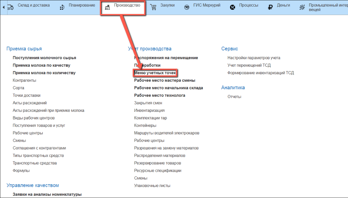 - В подсистеме "Производство" открываем "Меню учетных точек":