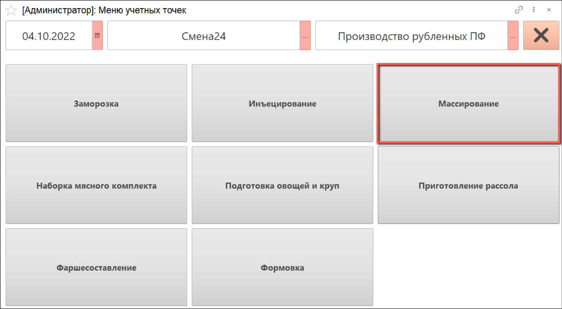 - Указываем дату смены, смену и рабочий участок, на котором будет выполняться массирование сырья.