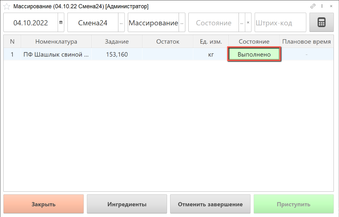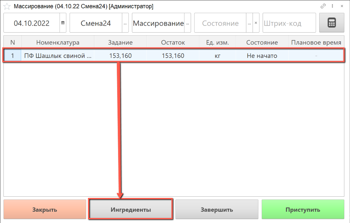 - В списке заданий выбираем строку производственного задания, по которому будет осуществляться наборка ингредиентов и нажимаем на кнопку "Ингредиенты".