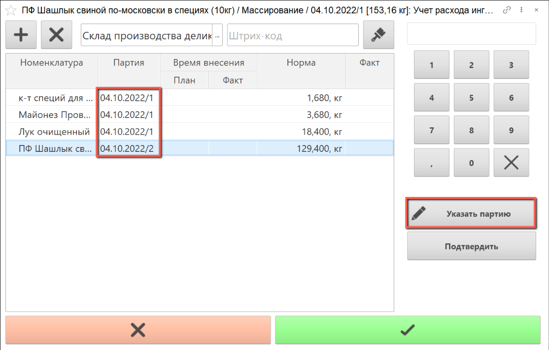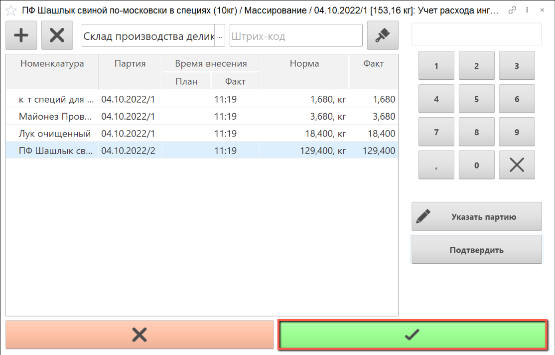 - Сканируем штрихкод партии сырья, или выбираем ее вручную.