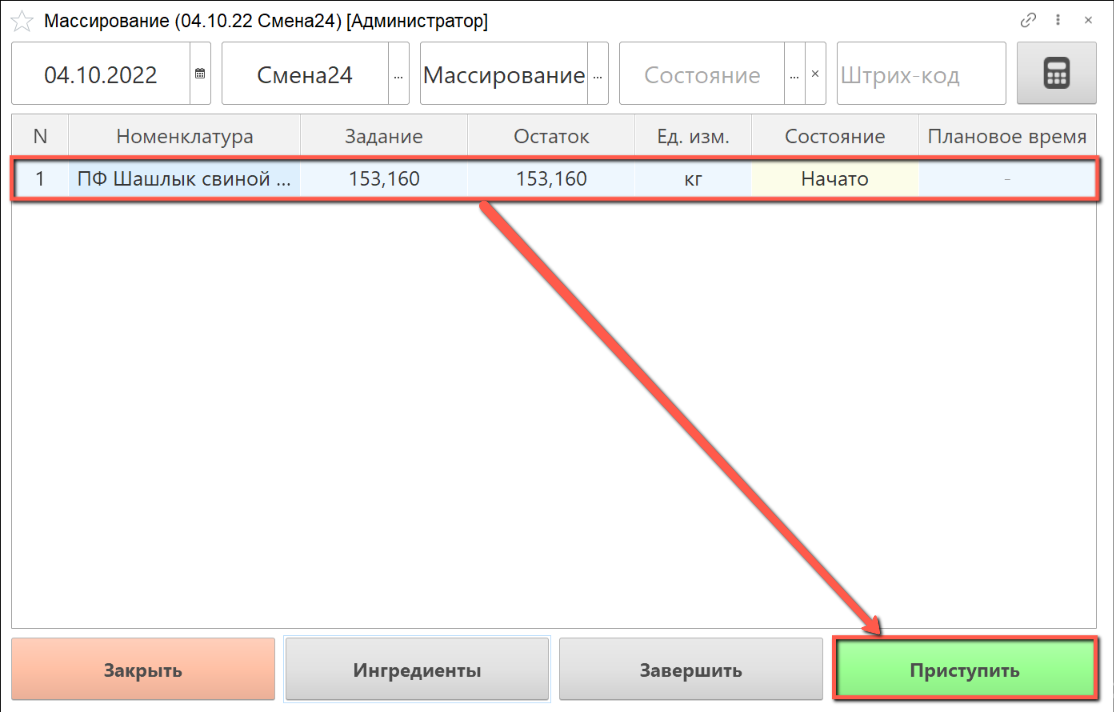 - Выбираем строку задания, по которому выполнено массирование, нажимаем на кнопку "Приступить":