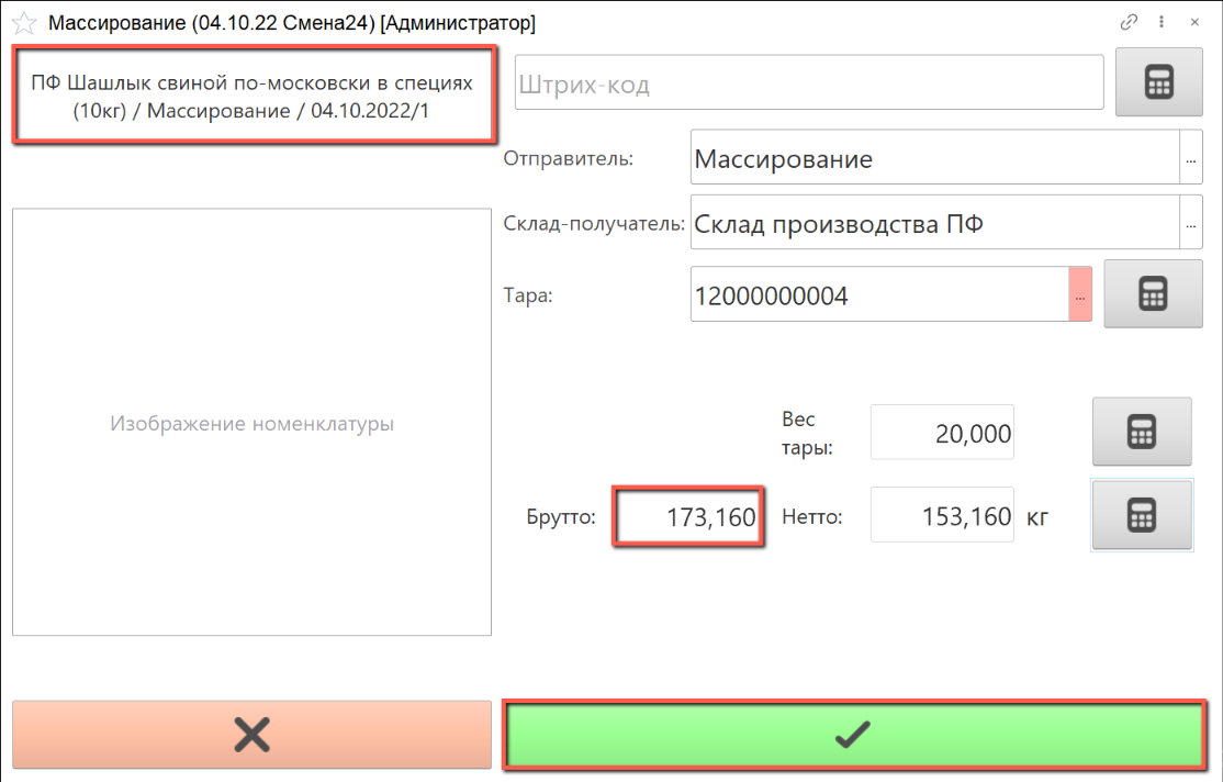 Получаем вес брутто с весов, вес нетто рассчитается автоматически.