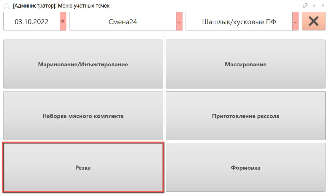 Указываем дату смены, смену и учетную точку, на которой будет производиться резка сырья.