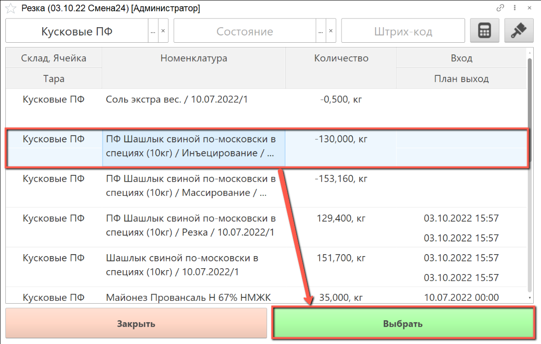 В табличной части указаны учетные остатки на участке производства полуфабрикатов. Сканируем штрихкод тары, партии продукции или выбираем нужную строку вручную.