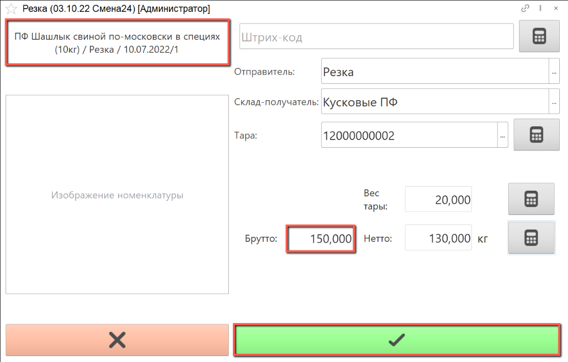 Слева указана номенклатура выходного изделия, которое предполагается взвесить.