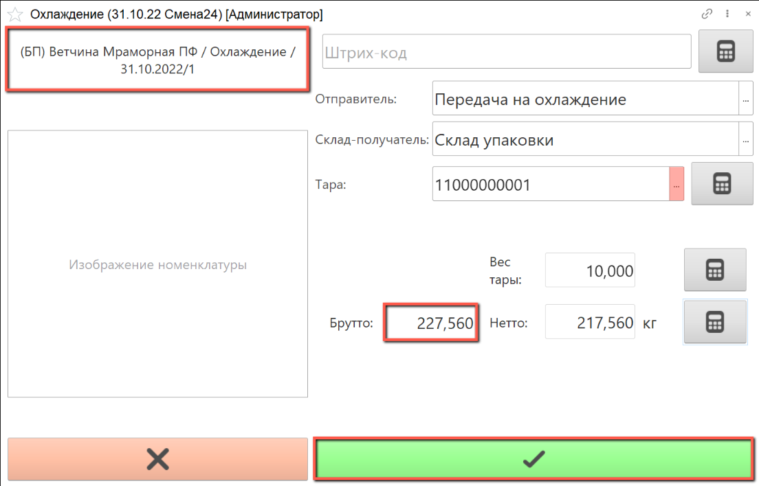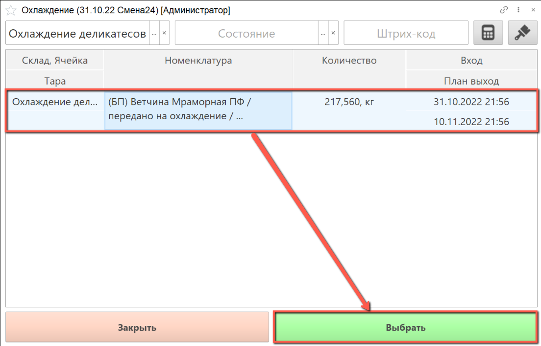 - В табличной части указаны учетные остатки на участке охлаждения с их плановым временем выхода. Сканируем штрихкод тары, партии продукции или выбираем нужную строку вручную.