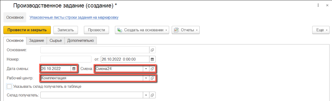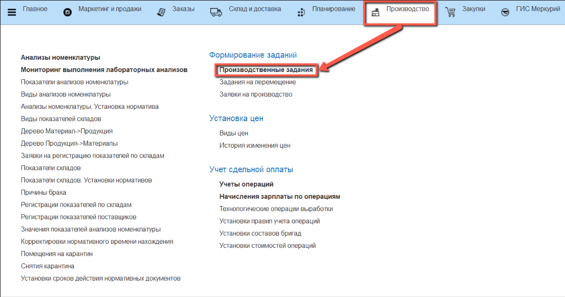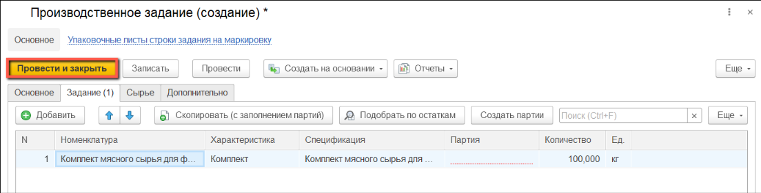 Для создания производственного задания на наборку комплекта мясного сырья в системе создаются документы "Производственное задание".