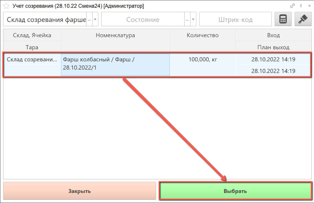 В табличной части указаны учетные остатки в камере созревания с их плановым временем выхода. Сканируем штрихкод тары, партии продукции или выбираем нужную строку вручную.