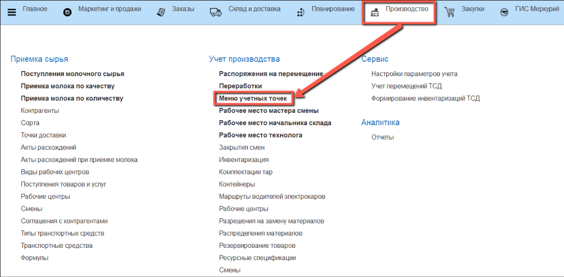 - В подсистеме "Производство" открываем "Меню учетных точек":