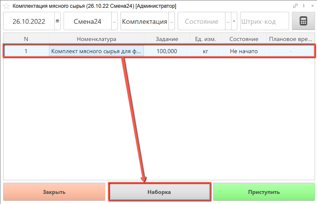 - В списке заданий выбираем строку производственного задания, по которому будет осуществляться наборка по рецептуре и нажимаем на кнопку "Наборка".