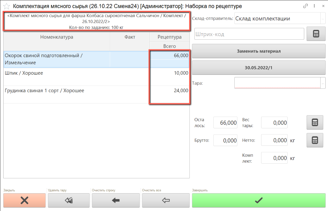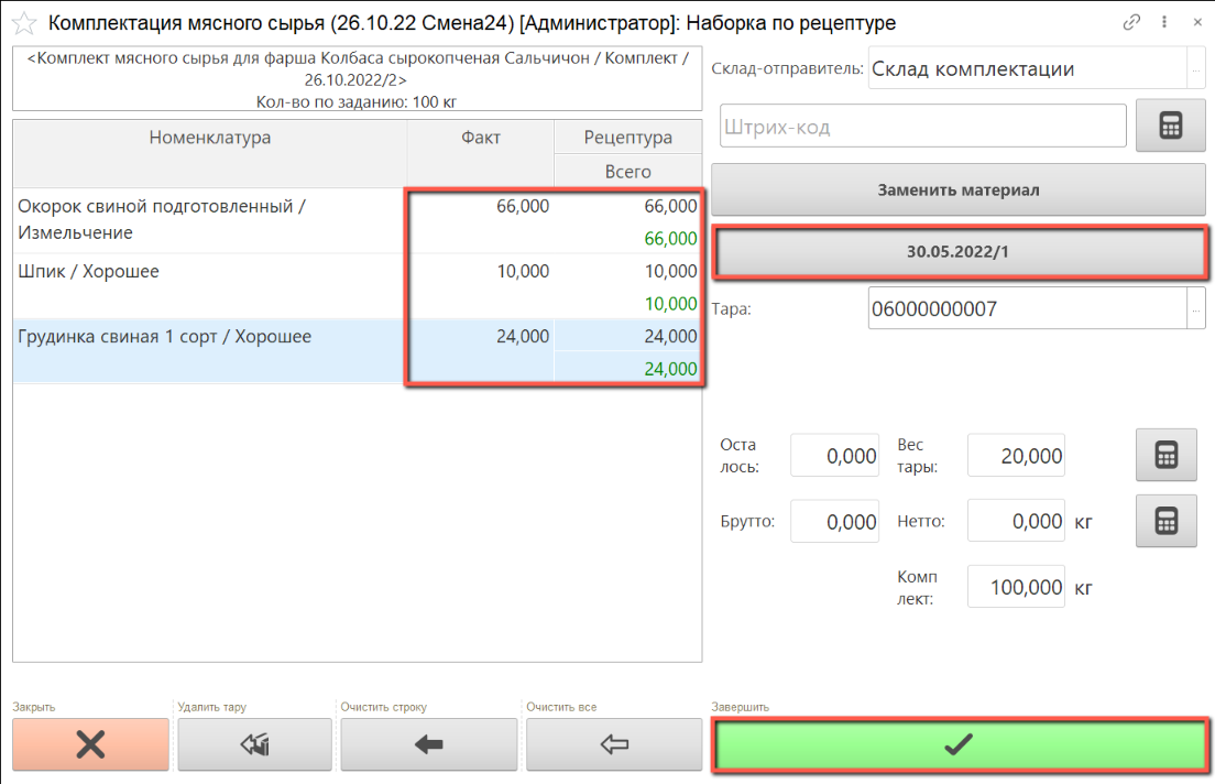 По завершении взвешивания сырья для комплектации нажимаем кнопку "Завершить":