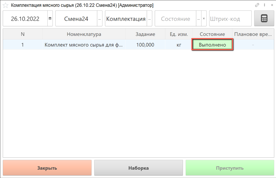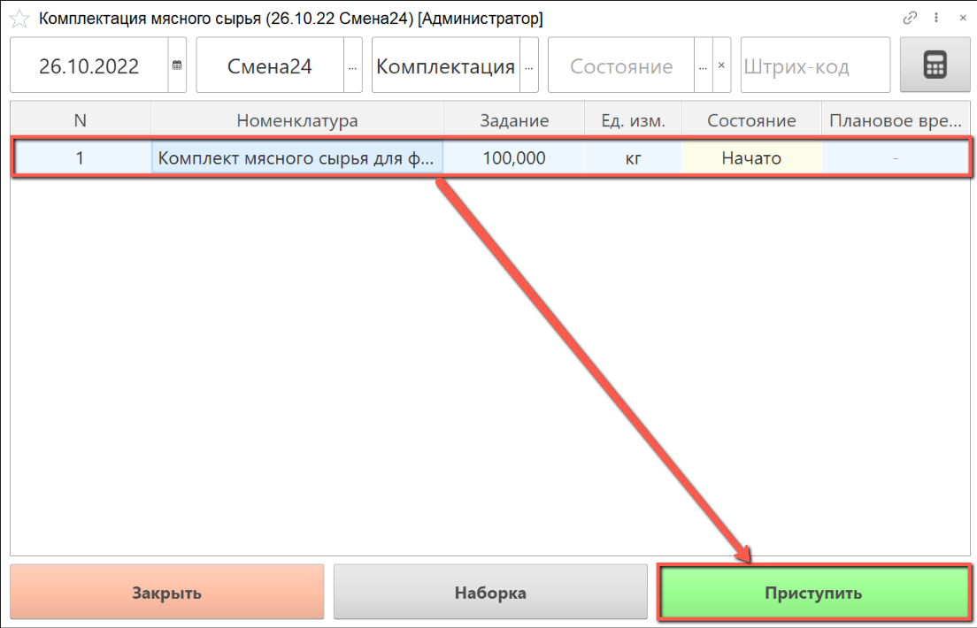 - Открылось окно наборки: слева находится информация о партии производимого полуфабриката и рецептура для наборки с указанием планового веса ингредиентов.